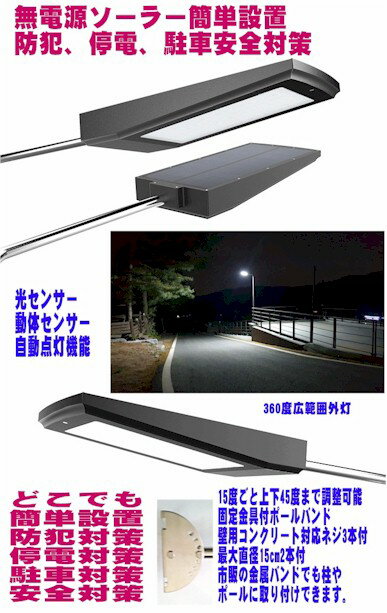 台風、停電や防犯、駐車場にどこでも付けられる無電源のソーラーパネル搭載のソーラー式街灯です。