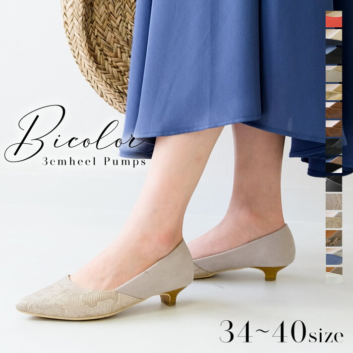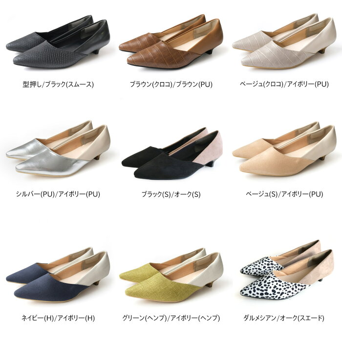 2021年春夏再販! パンプス 異素材 ローヒール バイカラー ポインテッドトゥ 3センチヒール レディース 歩きやすい 痛くない ブラック シルバー アイボリー 春夏 クロコ 型押し スエード 大きいサイズ スムース ルリアンプラス